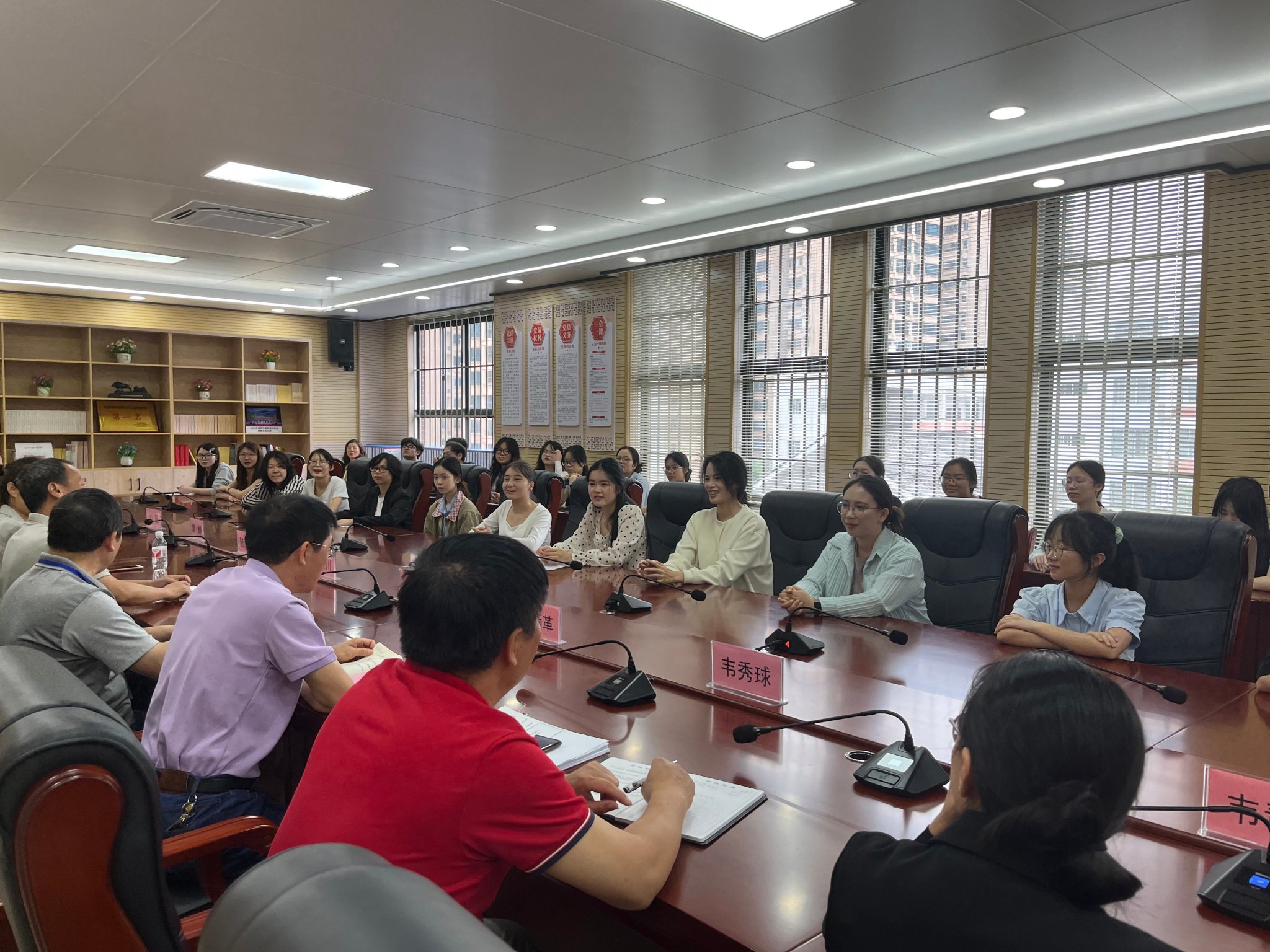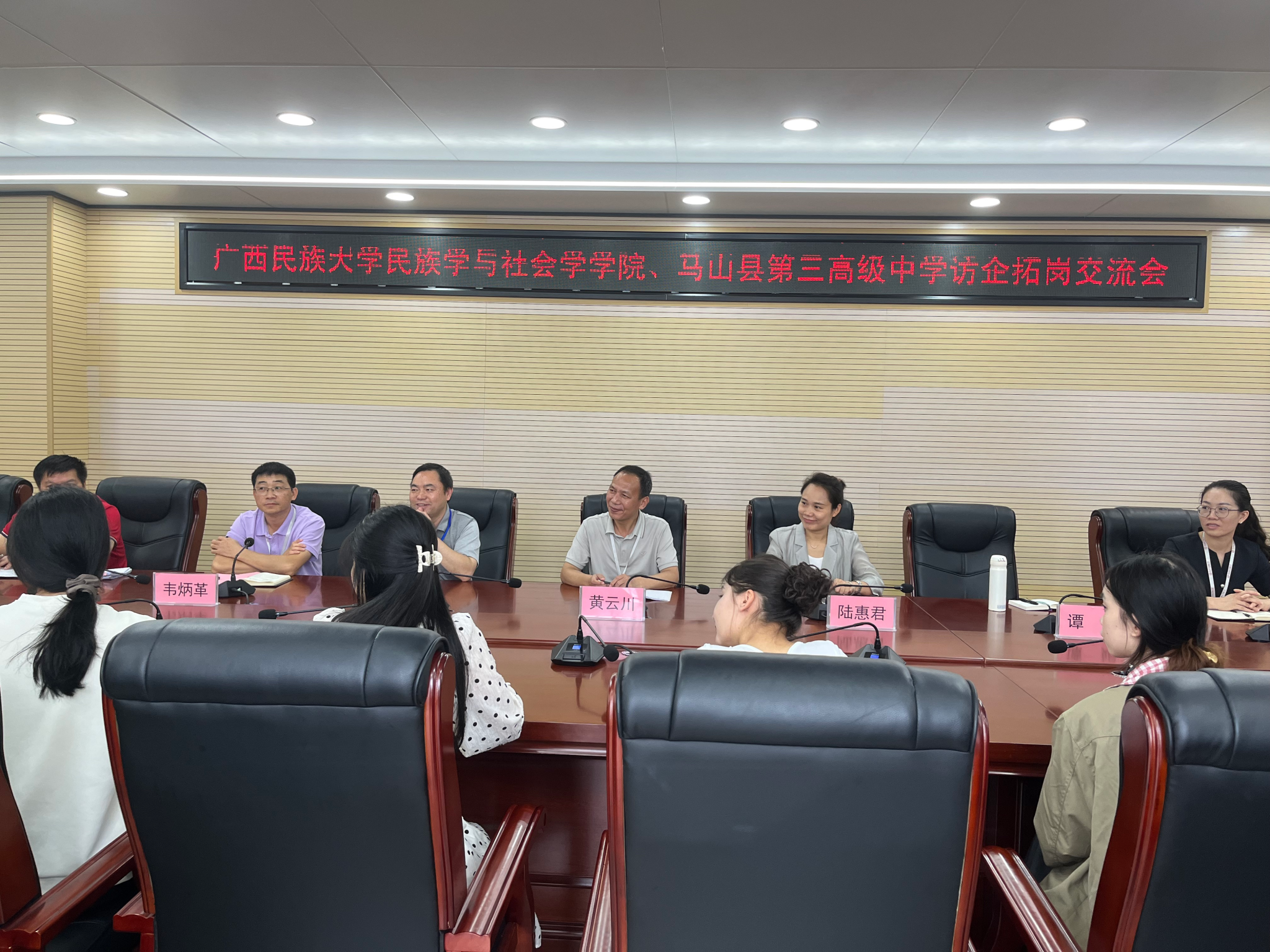 黄云川对公司实习员工的整体素质和在工作岗位上的表现给予充分肯定,并就未来双方合作事项进行了深入洽谈。陆惠君详细介绍了公司团队建设、人才培养、专业设置等情况,她希望未来双方在人才培养、继续教育、实践基地建设、课题研究等方面加强合作,同时希望通过此次访校拓岗行动,有更多的毕业生到马山县第三高级中学开展实习和工作。会上,师生双方就历史教师岗位胜任力、公司招聘要求等进行了自由交流。双方表示今后将就校校合作、人才培养、实践基地共建等展开更深入的合作。