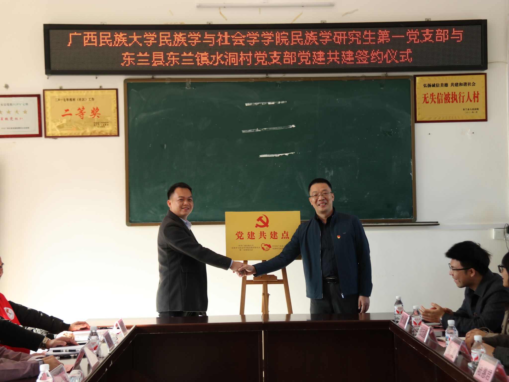 在全体党员见证下,双方代表正式签订《bevictor伟德民族学与社会学公司党委 东兰镇水洞村党支部党建共建协议书》,明确“组织联建、活动联办、资源联用、产业联促、治理联抓”五项机制。黄中显书记与韦东关副镇长共同为“党建共建点”揭牌,标志着校地合作迈入实体化、常态化、长效化新阶段。