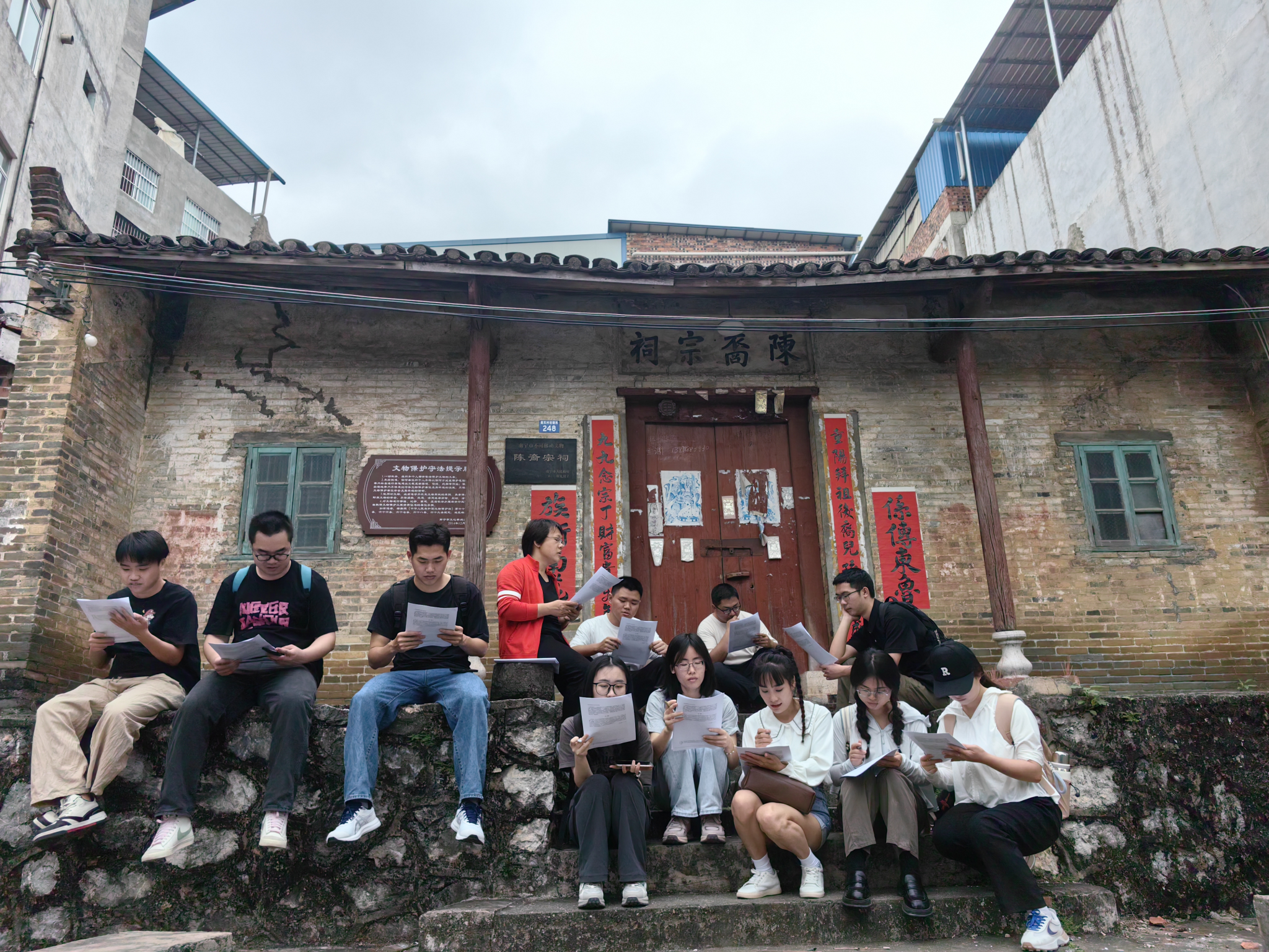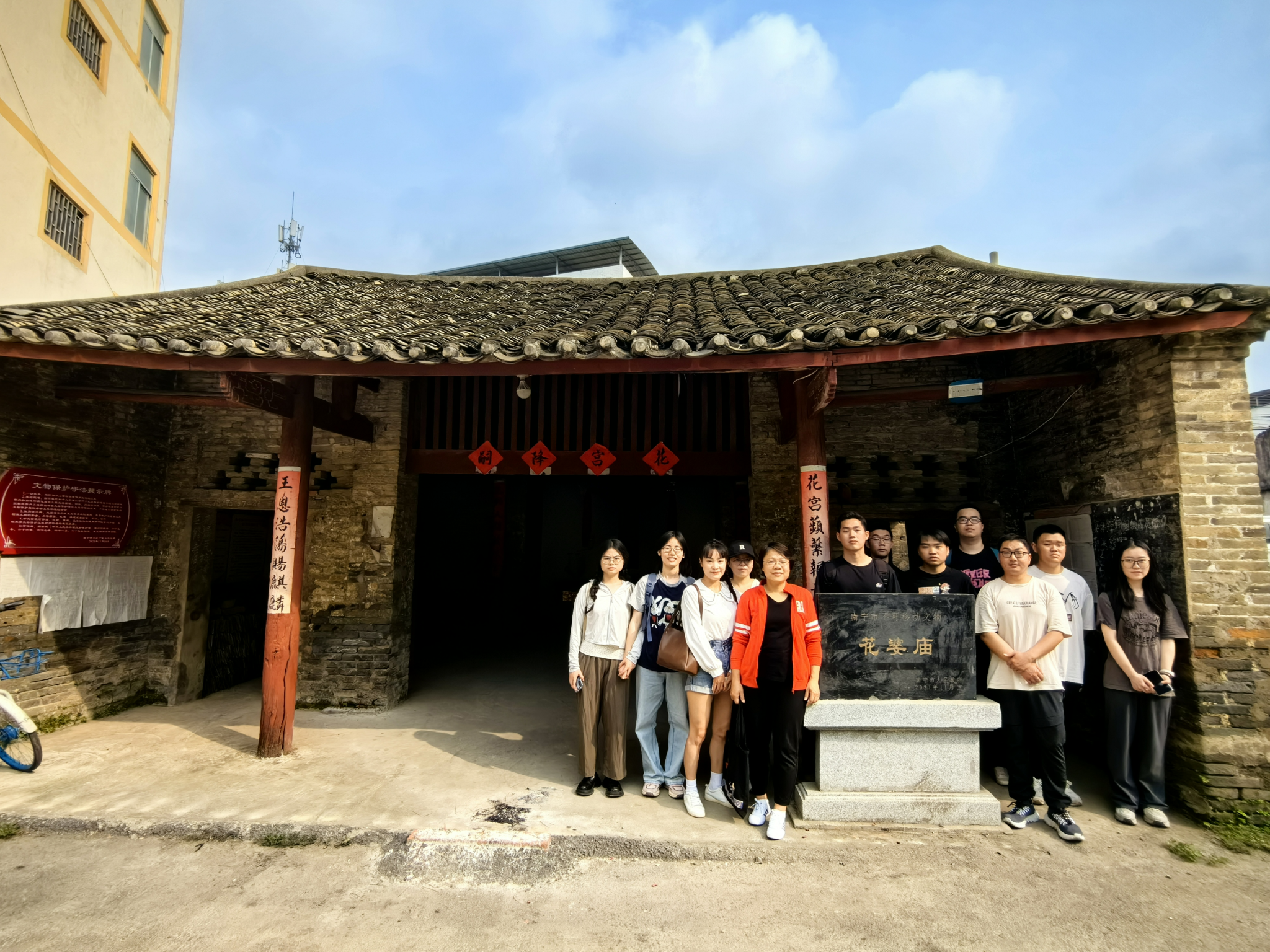 陈东村属于南宁市西乡塘区上尧街道办辖区,作为一个典型的城中村,村里除了有三座宗祠,还有建于清代的花婆庙,是研究宗祠文化与民间信仰重要田野点。师生们实地考察花婆庙,在陈裔宗祠前开展现场文献研读。随后到陈氏宗祠考察,并与宗祠负责人就城镇化浪潮下城中村的历史文化景观存续及历史文化街区建设等问题进行详细交流。