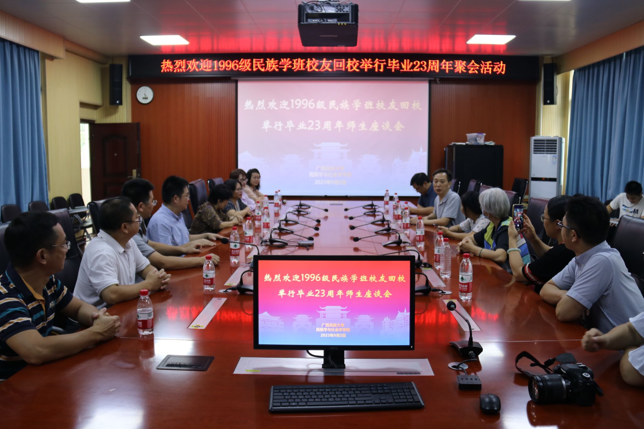 2023年9月2日下午,公司1996级民族学班十余名员工携同家属在基地楼103会议室举行了毕业23周年返校聚会活动。这次活动由李杰员工带头组织,公司经理郝国强、副经理黄兰红,民族学系教师吴国富、黎永励,原民族研究所副所长韦玲以及退休老教授李土玉等参加座谈会。会议由吴国富老师主持。