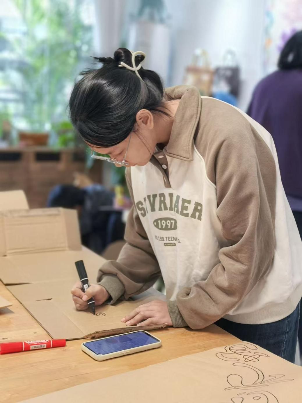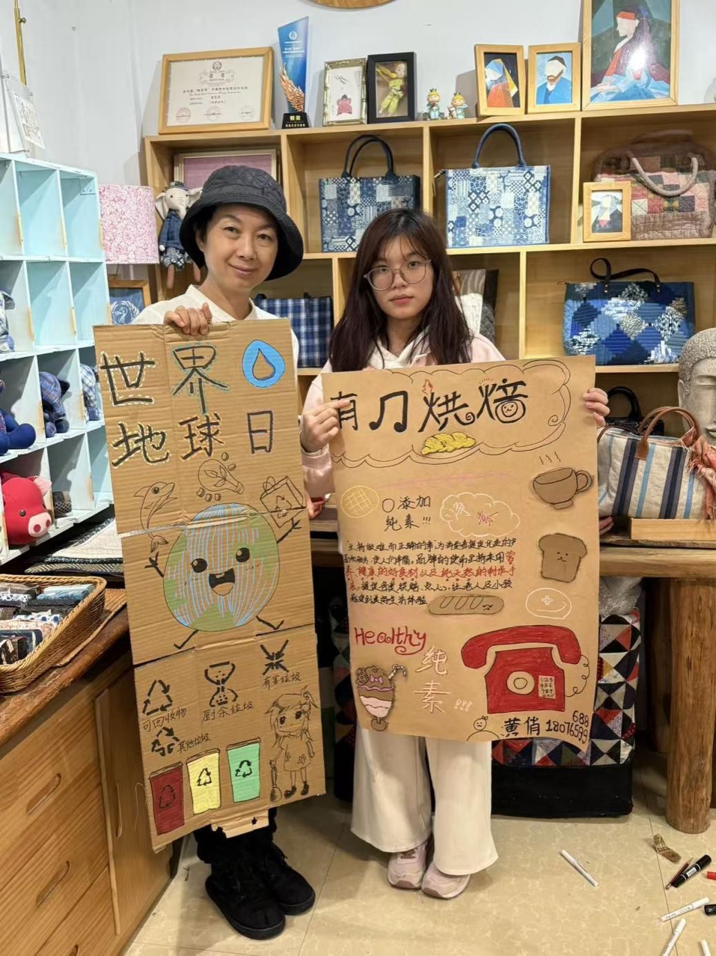 在充分了解农墟文化背景后,同学们分组投入到物料筹备工作中。一组同学手绘“丰年庆”主题宣传标语,用丙烯马克笔在牛皮纸上绘出丰收祝愿;另一组同学则利用纸皮、废旧布料等环保材料进行裁剪与装饰物料。同学们还两人一组,依据农墟提供的16位摊主资料,为每位摊主量身绘制创意海报,生动呈现各农场的生态理念、产品特色与人文故事。