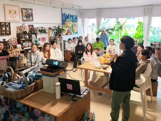 活动伊始,都市农墟志愿者孟芳为同学们生动介绍了南宁都市农墟的发展历程与核心理念,并详细讲解了农墟在生态农业推广、手工艺创作、社区共建等多个板块的工作内容。随后,各板块志愿者依次分享了他们在产品协作、活动策划、文化传播等方面的具体实践,让同学们对农墟的运作模式与社会意义有了更深地理解。在轻松愉快的交流环节,员工志愿者积极提问,农墟伙伴真诚回应,双方在对话中建立起温暖的协作纽带,也为接下来的物料共创注入了更多灵感与共识。